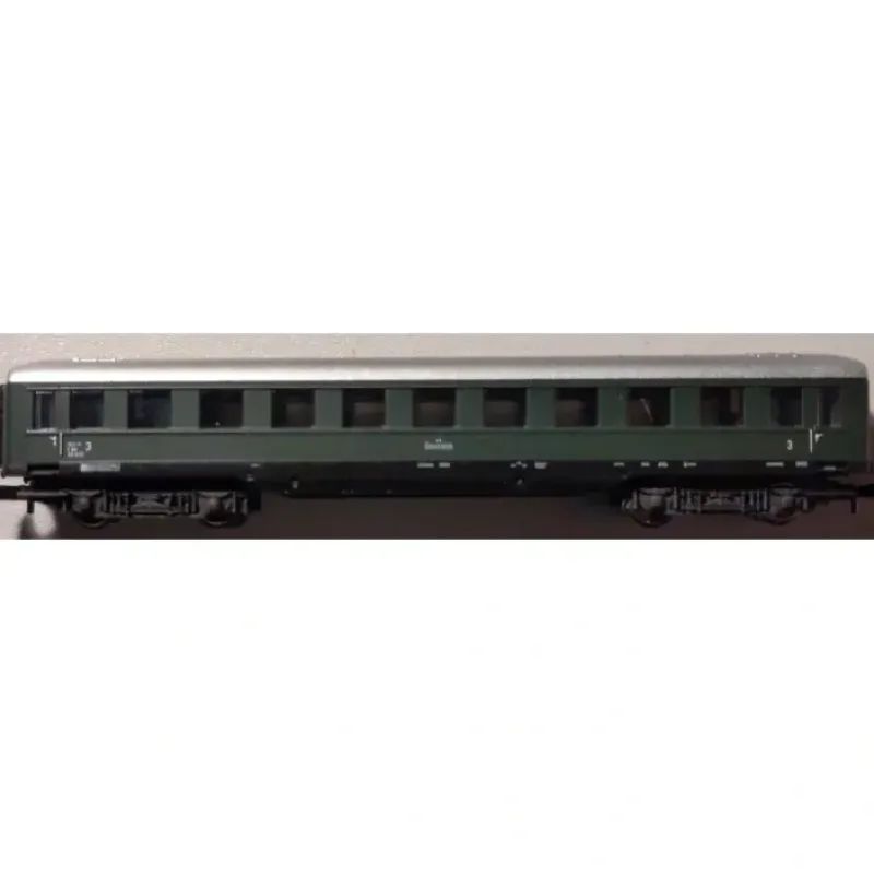 Here is a Marklin Z Scale DB 3rd Class Passenger Car. This passenger car features a durable plastic body construction with intricate detailing, metal wheels and axles, and fish-hook style couplers.
