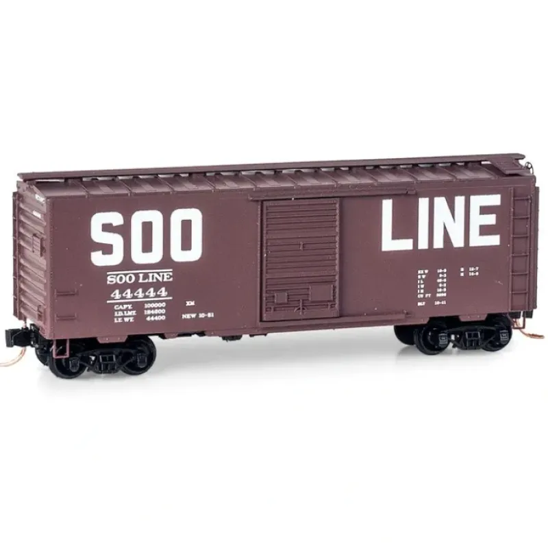 N Scale This 40 standard box car with single door is painted oxide red with white lettering and runs on Bettendorf trucks. It was built by Pullman Standard in 1941 as part of 50 car series #44100-44498, (even numbers only). The SOO LINE billboard lettering was adopted in 1951.
