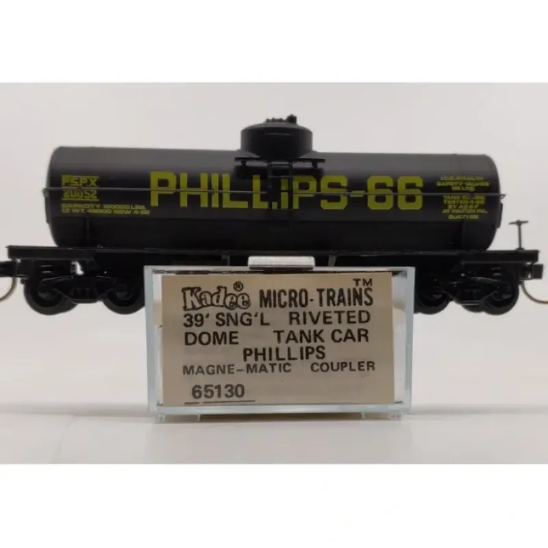 This is a Micro-Trains 65130 N Scale Phillips 39′ Riveted Single Dome Tank Car. It features plastic construction, plastic wheels and axles & has knuckle couplers.