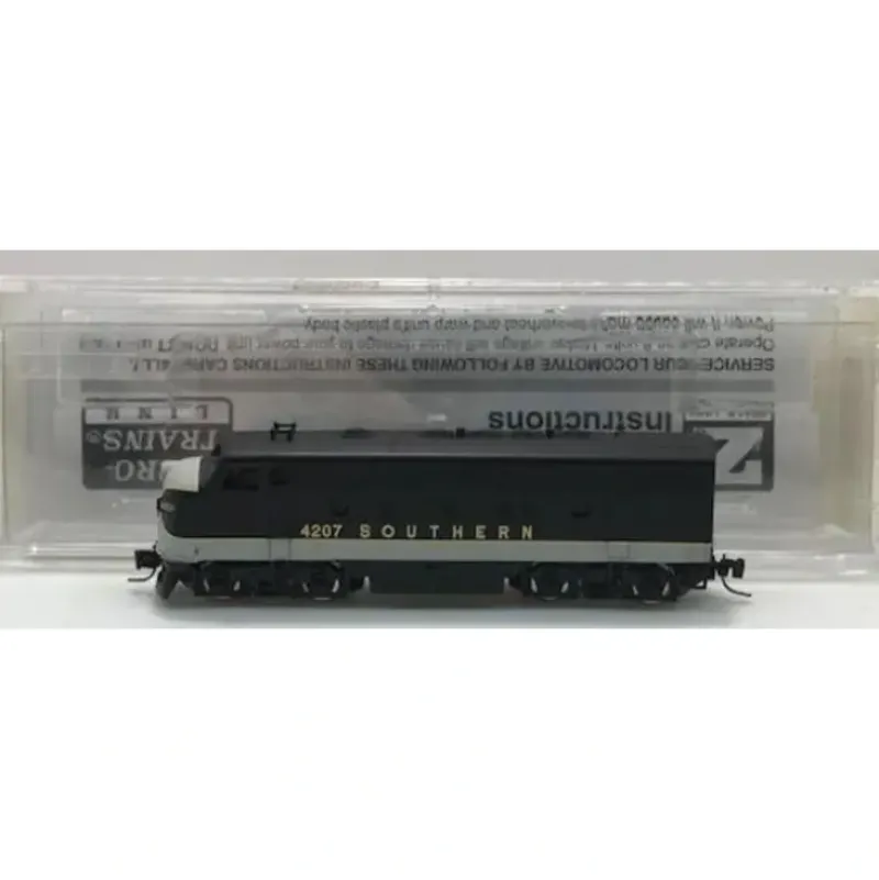 This is a Micro Trains Line 98001371 Z Scale EMD F7A – Standard DC Southern Railway #4207 (Tuxedo, black, white, gold) The EMD F7 was a 1,500 horsepower (1,100 kW) diesel-electric locomotive produced between February 1949 and December 1953 by the Electro-Motive Division of General Motors (EMD) and General Motors Diesel (GMD). A total of 2,366 cab-equipped lead A-units and 1,483 cables booster or B-units were built.