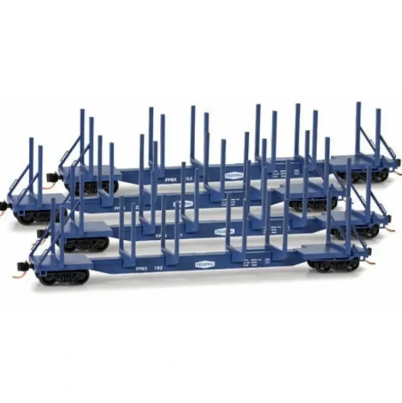 This is a 4-pack of MicroTrains 99300089 N Scale Federal Paper Log Cars. These feature plastic construction, plastic trucks, knuckle couplers, and plastic wheels.