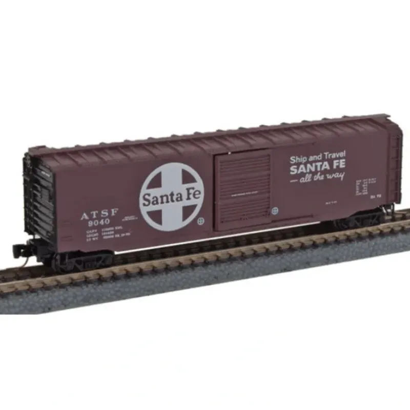 This is a Micro Trains Line 99400070 Z Scale 50′ Single-Door Boxcar 4-Car Runner Pack – Ready to Run Santa Fe #9004, 9016, 9038, 9040 (Boxcar Red, black, white, Large Logo)
