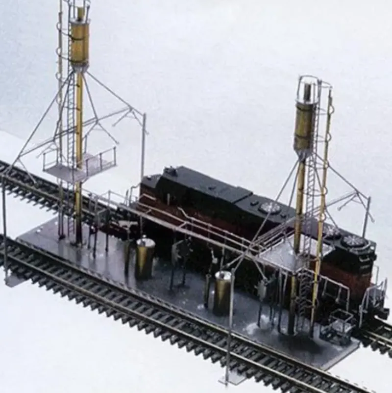 This is a Micron Art 1028 Z Scale 2-Track Diesel Locomotive Service Facility Etched-Metal Kit Full turnaround service structure for diesel locos will accommodate both hood and cab units. Includes sand tower, fuel arms and water and lubrication lines.
