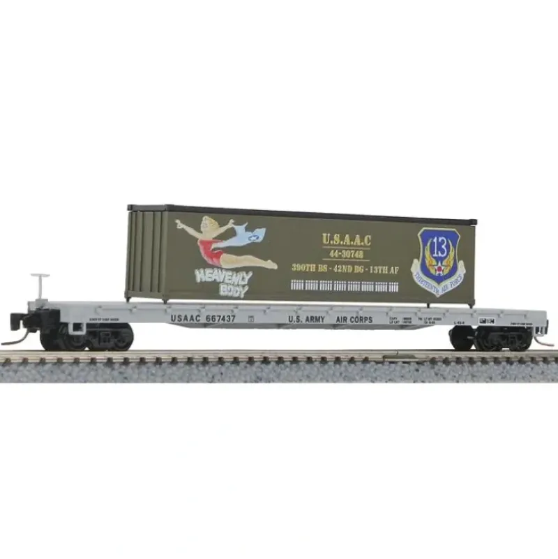 This is a Micro Trains Line 489-52400105 Z Scale 60′ Steel Flatcar w/40′ Container Load – Ready to Run USAAC #667423 (Heavenly Body, #5 in WWII Nose Art Series) Painted Navy grey with black lettering and carries a 40′ Olive Drab container featuring real WWII nose art known as Heavenly Body. Like many planes in WWII, this B-25J bomber was decorated with custom artwork by its pilot to personalize the plane. The Heavenly Body B-25J bomber was part of the 13th Air Force, the 42nd Bomb Group and 390th Squadron.