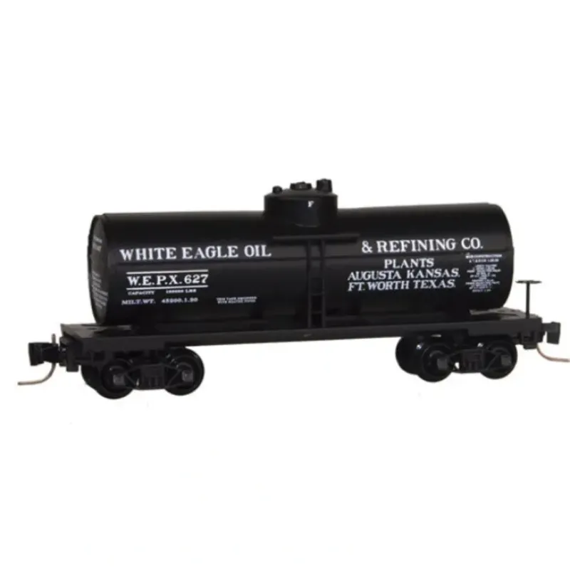This is a Micro Trains Line 489-53000407 Z Scale 40′ Single-Dome Tank Car – Ready to Run White Eagle Oil WEPX #627 (Tank Car Series #7, black, white)