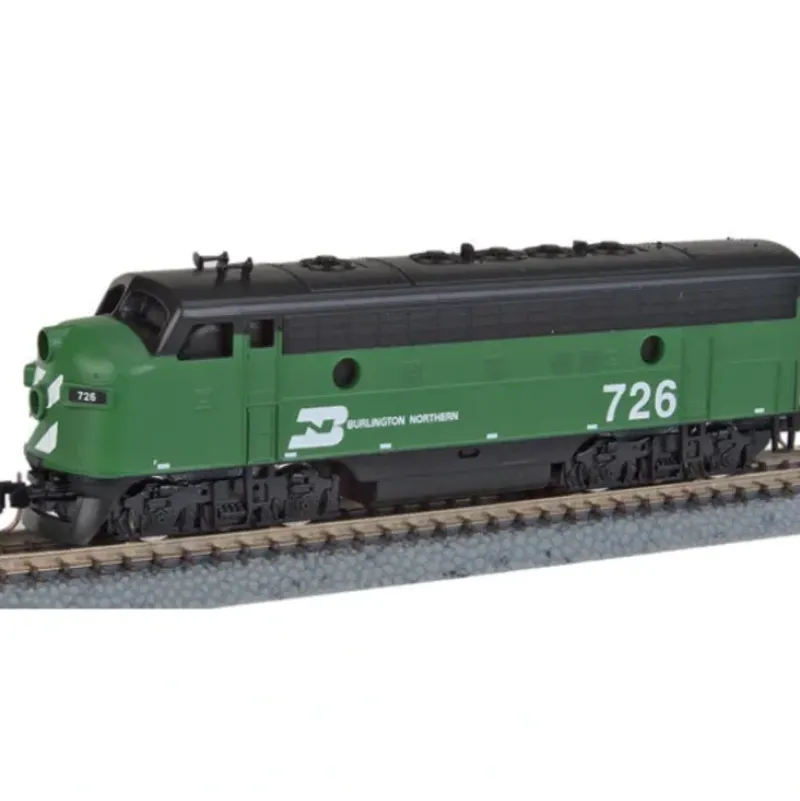 This is a Micro Trains Line 98001251 Z Scale EMD F7A – Standard DC Burlington Northern #726 (Cascade Green, black, white) The EMD F7 was a 1,500 horsepower (1,100 kW) diesel-electric locomotive produced between February 1949 and December 1953 by the Electro-Motive Division of General Motors (EMD) and General Motors Diesel (GMD). A total of 2,366 cab-equipped lead A-units and 1,483 cabless booster or B-units were built.