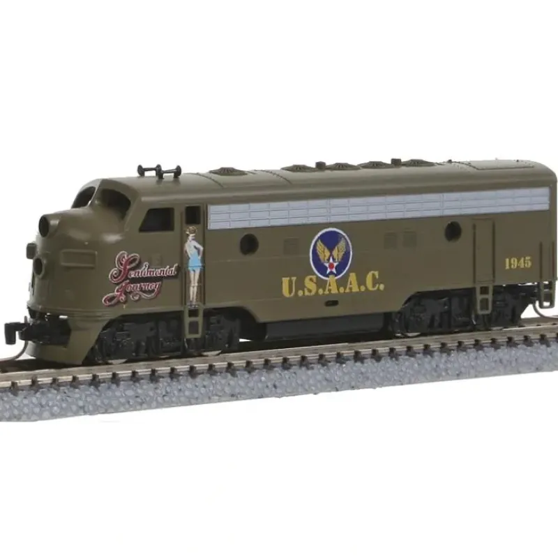This is a Micro Trains Line 98001530 Z Scale EMD F7A – Standard DC USAAC #1945 Sentimental Journey (Nose Art Series, olive, yellow, blue) The EMD F7 was a 1,500 horsepower (1,100 kW) diesel-electric locomotive produced between February 1949 and December 1953 by the Electro-Motive Division of General Motors (EMD) and General Motors Diesel (GMD). A total of 2,366 cab-equipped lead A-units and 1,483 cabless booster or B-units were built.