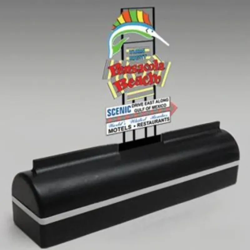 This is a Miller Engineering 2050 All Scales Pensacola Beach Florida Boxed Animated Desktop Sign. Collector’s will love these desktop signs. Featuring famous signs from around the country, each comes in a handsome display case. They function just like the real ones and are ready to run with batteries already installed. The visually famous sailfish has pointed visitors and locals alike toward Pensacola Beach for over 40 years. The iconic sailfish was heavily damaged by hurricanes and tropical storms in 2004 and 2005, but has been fully restored to its full glory once again. The star-shaped centerpiece contains nearly 1,000 feet of handmade neon tubing, over 1,000 flashing colored bulbs and thousands of feet of electrical wiring This replica sign has been designed to function just like the real one using space age materials and manufacturing. Dimensions: Sign: 4-1/4 tall x 2 wide Base: 6-1/4 wide x 1-3/4 high x 1-1/2 deep Kit includes: Includes animated sign and desk top base Runs on 3 AAA batteries (not included) or 4.5v DC power supply (sold separately).