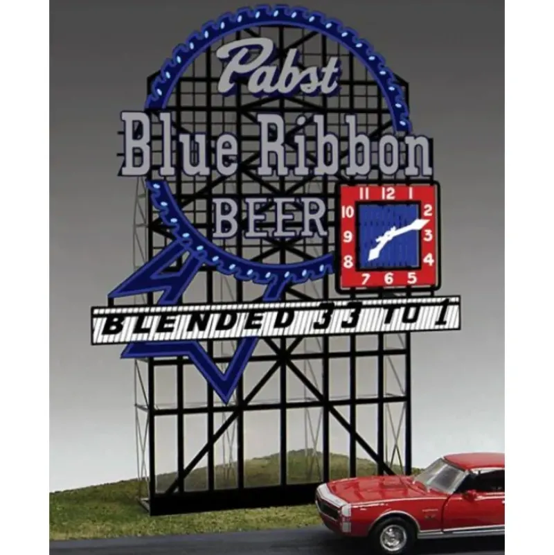 This is a Miller Engineering 4081 HO/O Scales Pabst Blue Ribbon Animated Neon Billboard 4-1/2 x 8-3/8 11.4 x 21.3cm. A must-have for Chicago modelers, this kit includes etched supports to make a freestanding billboard. Clock is non-operable. Limited run.
