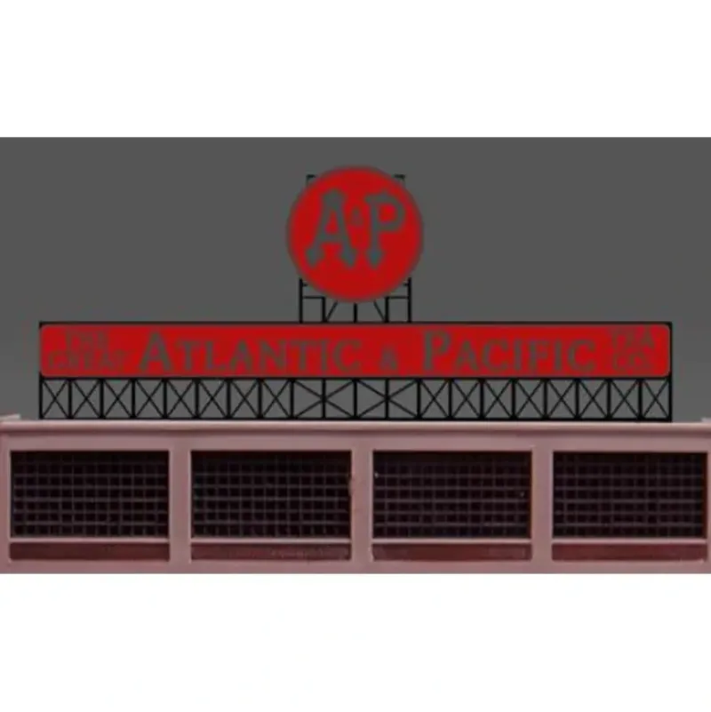 This is a Miller Engineering 440152 N/HO Scales Atlantic & Pacific Tea Animated Neon Billboard – Light Works USA(TM) Small . In 1859, the Great Atlantic & Pacific Tea Company, known everywhere as A&P, began as a mail-order business located at 31 Vesey Street in downtown Manhattan. In 1936, A&P became the first national supermarket chain in the United States The company experienced financial and filed for Chapter 11 protection in 2010. March 13, 2012 it was announced that A&P had emerged from bankruptcy and is now a private company. Great addition to your layout or a diorama. Dimensions: approx. 1.6 high x 5.5 wide Kit includes: Electroluminescence sign lamp Power supply (requires 3 AAA batteries – not included) Complete instructions Runs on 3 AAA batteries (not included) or #4802 4.5v DC power supply (sold separately).
