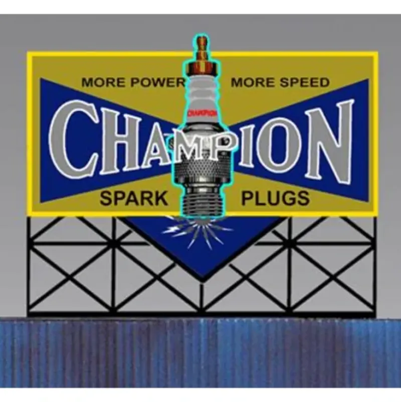 This is a Miller Engineering 5072 N/HO Scales Animated Neon Billboard Champion Sparkplug – Small 2-13/32 Wide, 2-1/16 Tall. From dancing chase lights to pointing arrows, these animated electroluminiscent billboard kits feature a wide variety of colorful, simulated-neon graphics for a variety of businesses. Kits include battery holder and all necessary electronics for plug-and-play installation. Signs require three AAA batteries (not included). Just install them on your building rooftops or along highways. Large signs are suitable for HO and larger scales, medium signs are usable as large N Scale signs and in HO Scale.