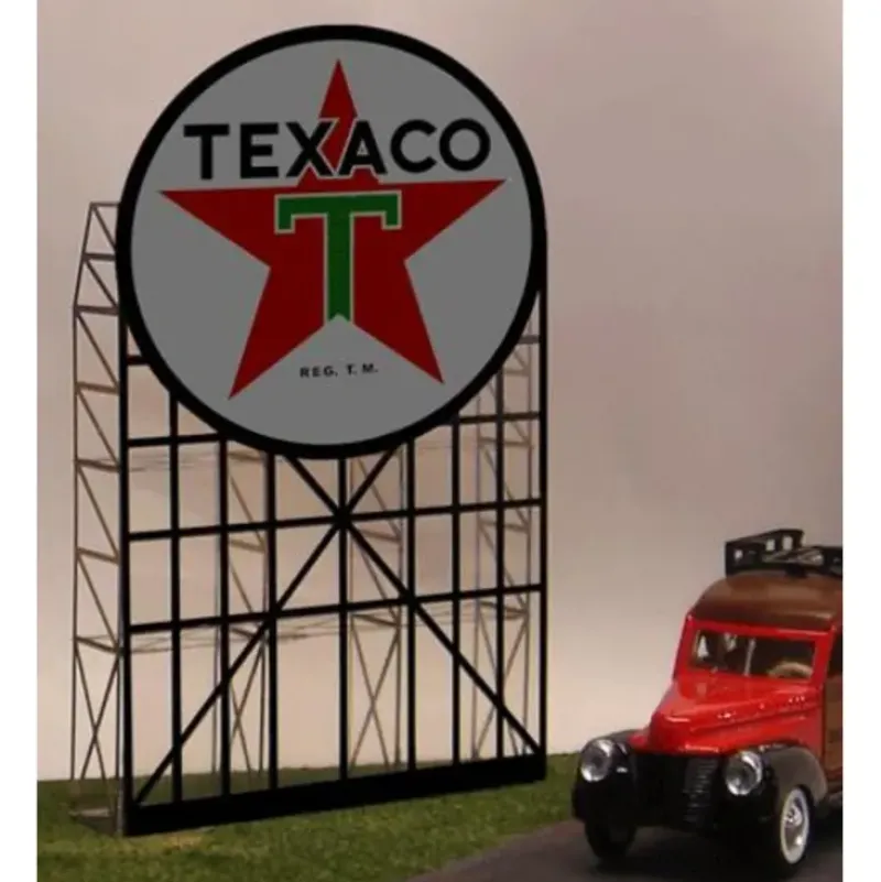 This is a Miller Engineering 5181 HO/O Scales Texaco Animated Neon Billboard 4-1/2 x 7-7/8 11.4 x 20cm. Miller Engineering’s fifth gas station sign! They have animated the classic star to make it a real eye catcher on any layout. Complete with the support structure to make a stand alone billboard.It features: – One EL Sign Lamp – Photo-etched Stainless Steel Supports – One Ready-to-run Power Supply – Runs on 3 AAA Batteries (not included) – Complete Instructions – Suitable for HO and O Scales – Dimensions (Width x Height): 4-1/2 x 7-9/10 (11.5cm x 49.3cm).