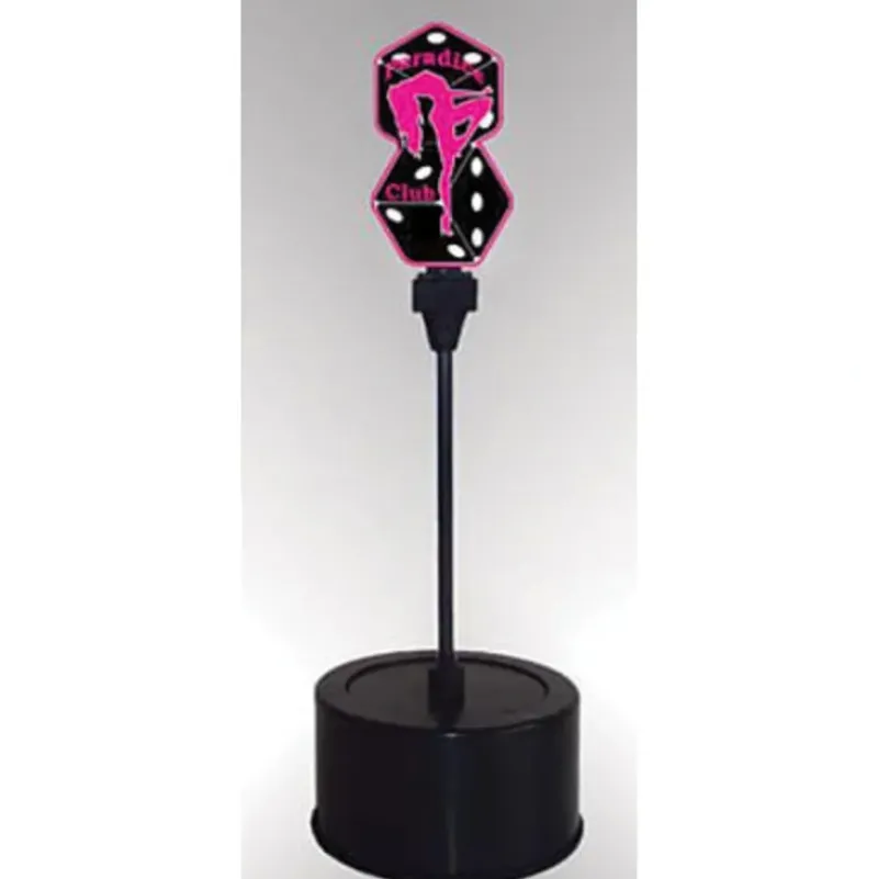 This is Micro Structures 55075 O Paradice Club Double-Sided Rotating Sign – Light Works USA. The base is 2 tall and has a 3.2 diameter. Total height to sign from base is 5.375. The unit runs on 3 AAA batteries so it can be a stand-alone unit. There is an AC jack on the side and it is compatible with all Miller Engineering’s AC adapters. They have also added a 2nd AC jack on the bottom of the unit so the cord can be hidden from view when it is mounted on your layout. Additionally, Miller Engineering will have an optional top plate that will allow you to mount the unit flush, completely hiding the rotating unit under your layout. All signs are double-sided and have the option of either All On or Flashing.