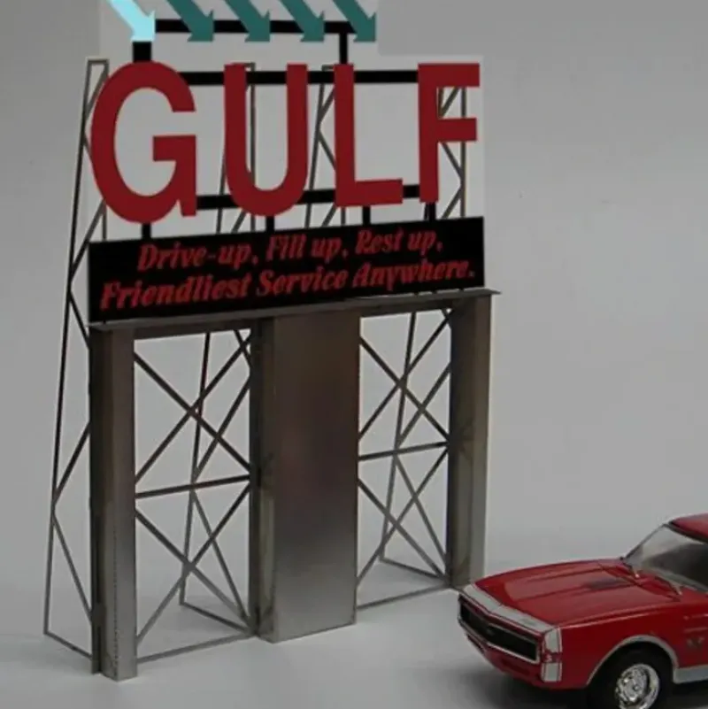 This is a Miller Engineering 8181 HO/O Scales Gulf Gas Animated Roadside Billboard. HO/O scale animated billboard sign. a Miller Engineering Engineerings Roadside Billboards signs incorporate all the great features of our Light Works signs plus a complete photo etched stainless steel support thats easy to put together and will add a whole new dimension to your layout. This easy to build kit comes with complete, easy to follow instructions. Great addition to your layout or a diorama. Kit includes: Electroluminescence sign lamp Billboard stand and supports Power supply (requires 3 AAA batteries – not included) Complete instructions Dimensions: 4.3 high x 5.8 wide Runs on 3 AAA batteries or 4.5v DC wall adapter power supply (sold separately).