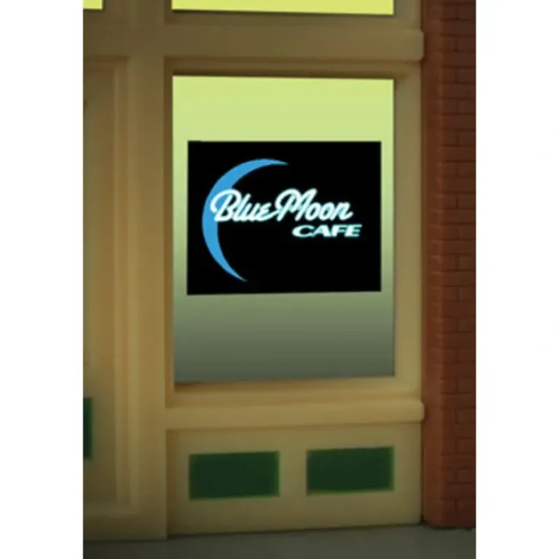 This is a Micro Structures 8960 HO/O Blue Moon Cafe Flashing Neon Window Sign – Light Works USA 7/8 x 5/8 2.3 x 1.6cm.