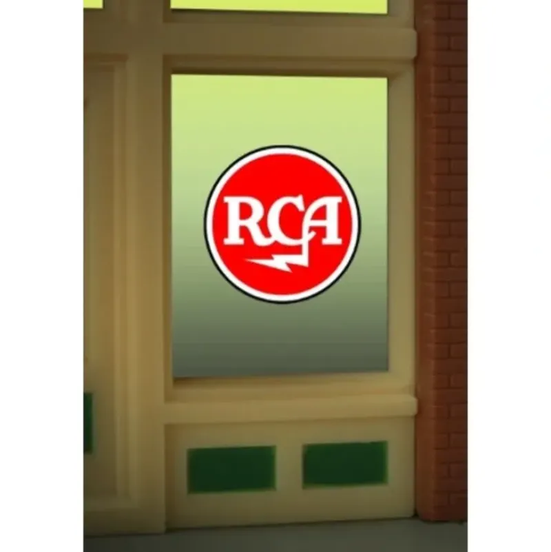 This is a Miller Engineering 9000 HO/O Scales RCA Flashing Neon Window Sign – Light Works USA Oversized Clear Background – Cut to as small as 7/8 2.3cm Diameter. Makes a great companion sign to our rooftop billboard #8071.Can be trimmed as small as .8 Dia.
