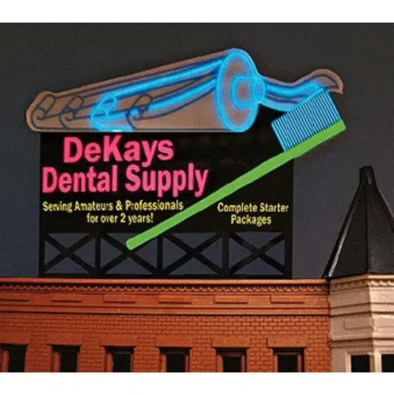 This is a Miller Engineering 9882 N Scale Animated Neon Billboard DeKays Dental Supply Medium 2.6 x 1.75. From dancing chase lights to pointing arrows, these animated electroluminiscent billboard kits feature a wide variety of colorful, simulated-neon graphics for a variety of businesses. Kits include battery holder and all necessary electronics for plug-and-play installation. Signs require three AAA batteries (not included). Just install them on your building rooftops or along highways. Large signs are suitable for HO and larger scales, medium signs are usable as large N Scale signs and in HO Scale. Features lighted lettering. Tube grows smaller as toothpaste comes out.