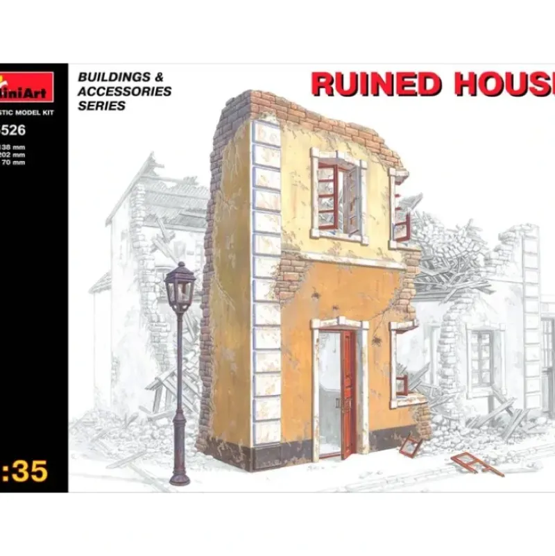 This is a MiniArt 35526 1:35 Ruined House. Highly detailed plastic pieces molded in grey.Length: 5.43 Width: 2.75 Height: 7.95 Illustrated instruction sheet.