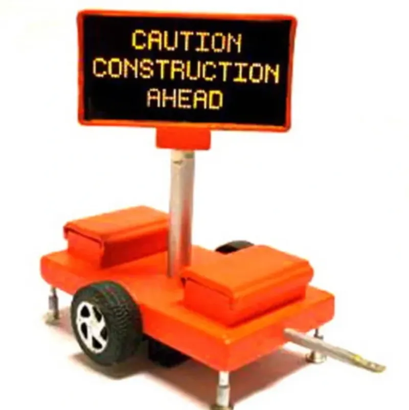 This is Miniatronics 8550101 O Road Sign, Construction Ahead. Mobile highway sign with 3v DC transformer. Locate anywhere on your model railroad layout that needs to signal a traffic pattern change. The most realistic appearance of a highway sign forewarning of traffic conditions. These signs replicate the various warning signs seen on the highways. Add the arrows sold separately and you have created a unique scene for your diorama.