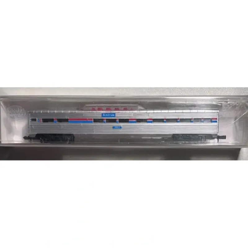 Here is a Model Power 3053 N Scale Amtrak Vista Dome Car. Features include plastic construction, plastic trucks, plastic couplers, and metal wheels and axles. It measures approximately 6 inches in length.