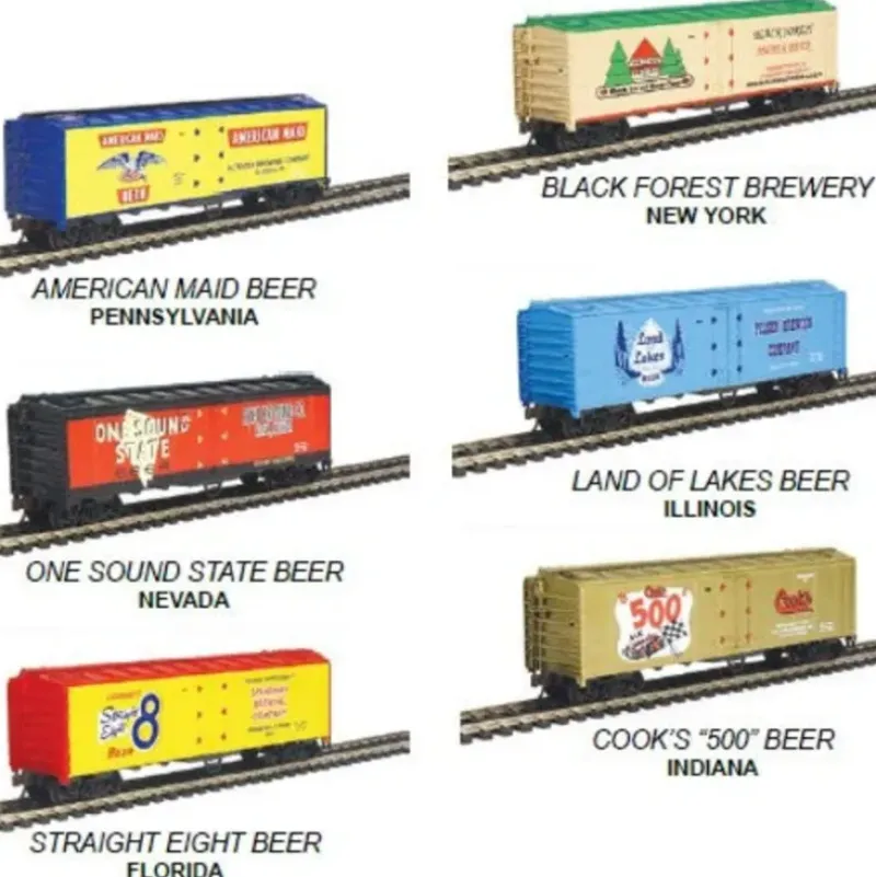 This is Model Power 98706 HO Beer Car Assortment w/Handle (6). Painted in real life, genuine microbrewery schemes with specific logos, these quality constructed, weighted cars are equipped with magnetic knuckle couplers. They’re packaged i n a distinct 6-pack carrying case with handle. Set includes one each: American Maid Beer (PA), Black Forest Brewery (NY), One Sound State Beer (NV), Land of Lakes Beer (IL), Straight Eight Beer (FL) and Cook’s 500 Beer (IN).