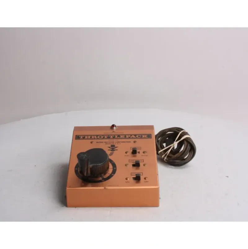 This is an MRC 500 HO Scale Throttle Pack. This transfomer features a copper housing, throttle control knob, directional control, overload indicator, power pulse, variable DC track put, 16v AC accessory output, and 12v constant dc output.. These have been tested and everything works fine. The one shown in the photos is an example. The ones we sell all look good, These may or may not come with an original box.