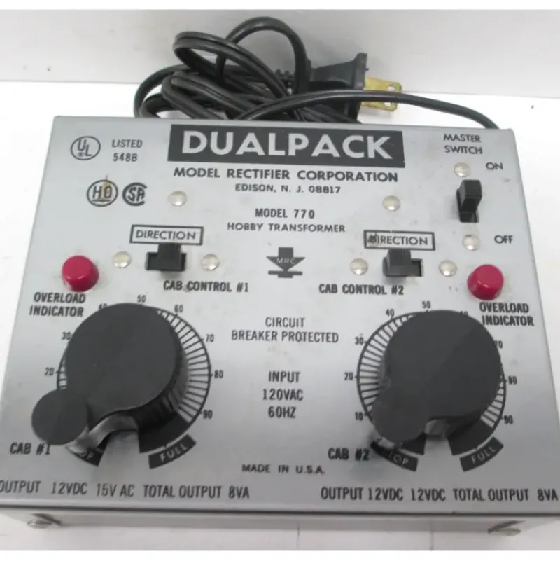 This is an MRC 770 HO Scale Train Control Dualpack. Features include two independent sets of operating controls, power to run four trains, can be used with common rail circuits, overload indicator lights, and taper wound speed controls.