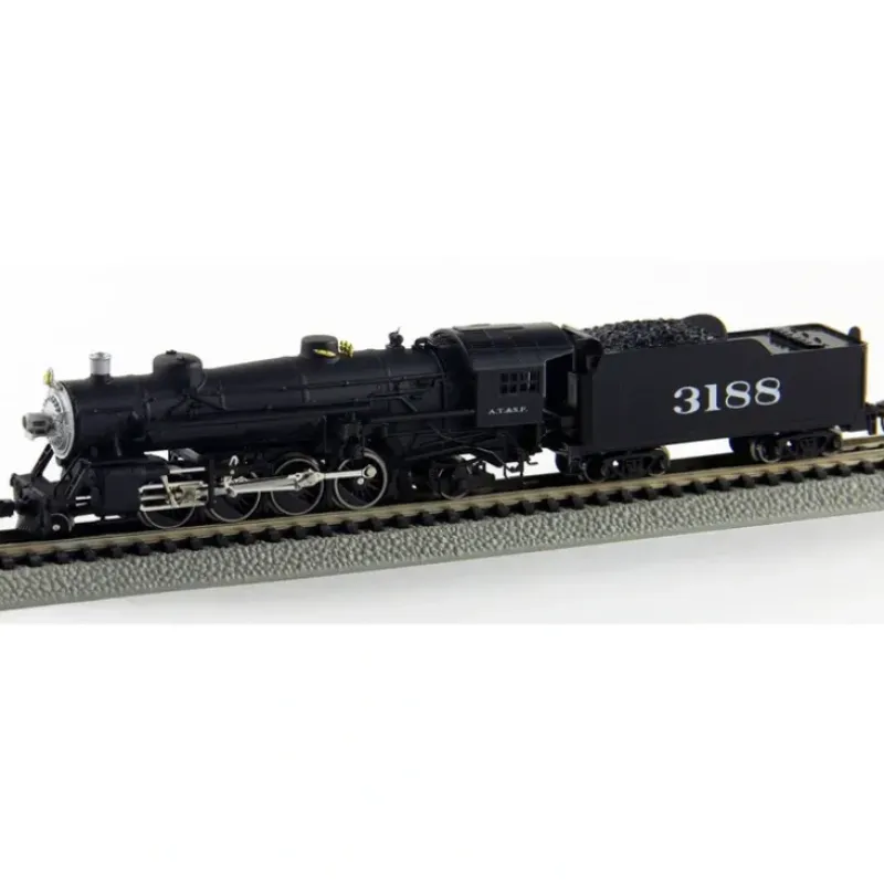 This is an MRC 875721 N Scale Santa Fe USRA 2-8-2 Mikado Standard Tender with Sound & DCC (black, silver). Features die cast metal boiler, cylinders and frame plus pilot truck pickup, LED lighting and precision brass flywheel and worm gear.