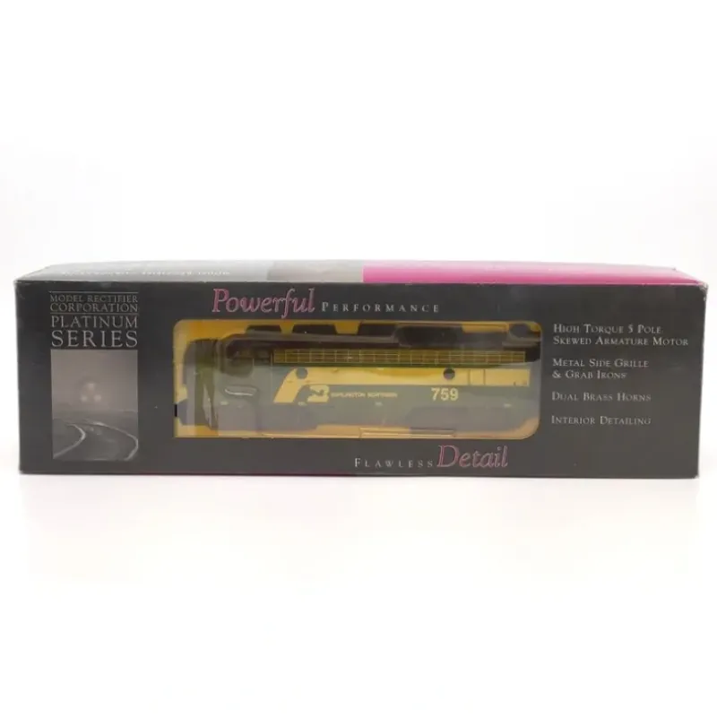 Here is an MRC CB113 HO Scale Burlington Northern F7A Diesel Locomotive #759. This car features plastic construction, a powerful motor, plastic trucks, metal wheels and axles, and knuckle couplers.