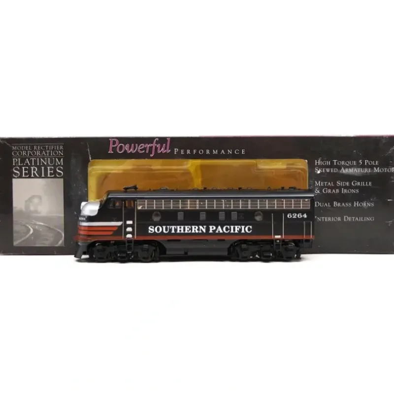 Here is a MRC HO Scale Southern Pacific F7A Diesel Locomotive #6264. This car features plastic construction, plastic trucks, metal wheels and axles, and a motor.