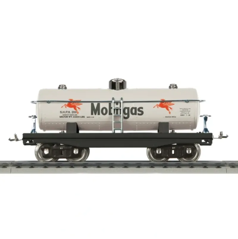 This is MTH 11-30178 TP Std.Gauge Mobil #215 Tank Car. In 1926, Lionel replaced the primitive-looking large-size freight cars it had cataloged for 20 years with the new 200-series standard gauge cars: Not only are these new cars patterned after the big all-steel cars that carry freight across the country, but they incorporate many original and exclusive features of design that only Lionel can carry out to such perfection. The illustrations clearly show that every known type of modern car is faithfully reproduced by us. It is great fun to convert your ‘Lionel Standard’ Passenger Train into a big Freighter by adding an assortment of these well-built and handsomely finished cars. The 200-series cars were cataloged as for use with Locomotives Nos. 380E, 381E, 402E, 408E and 400E, although on one occasion, in the 1930 catalog, they appeared in a De-Luxe set with the smaller 390E steamer. Its key features are: Baked enamel finish Stamped steel body and chassis Metal wheels and axles Operating metal latch couplers Colorful, attractive paint schemes Nickel trim Unit measures: 14 3/4 x 3 3/4 x 5 3/4 Operates on STD-42 curves