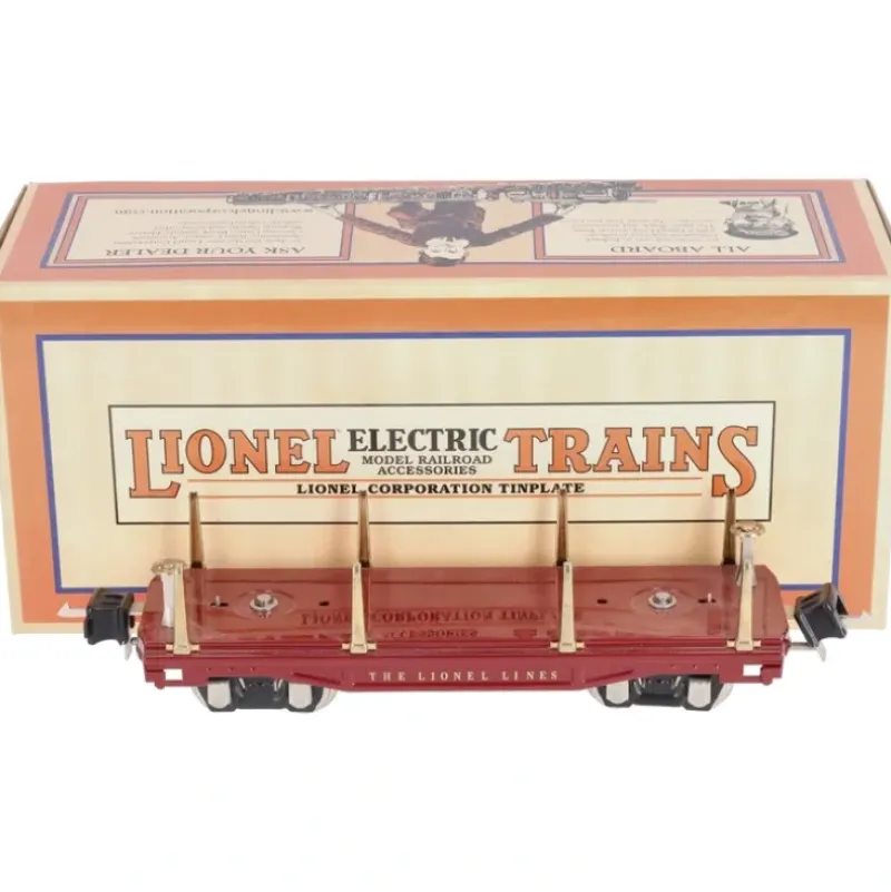 Here is a MTH 11-70018 O Gauge No.2811 Maroon Tinplate Flatcar with Stakes. This car is made by MTH and is part of the new “Lionel Corporation Tinplate” Line.
