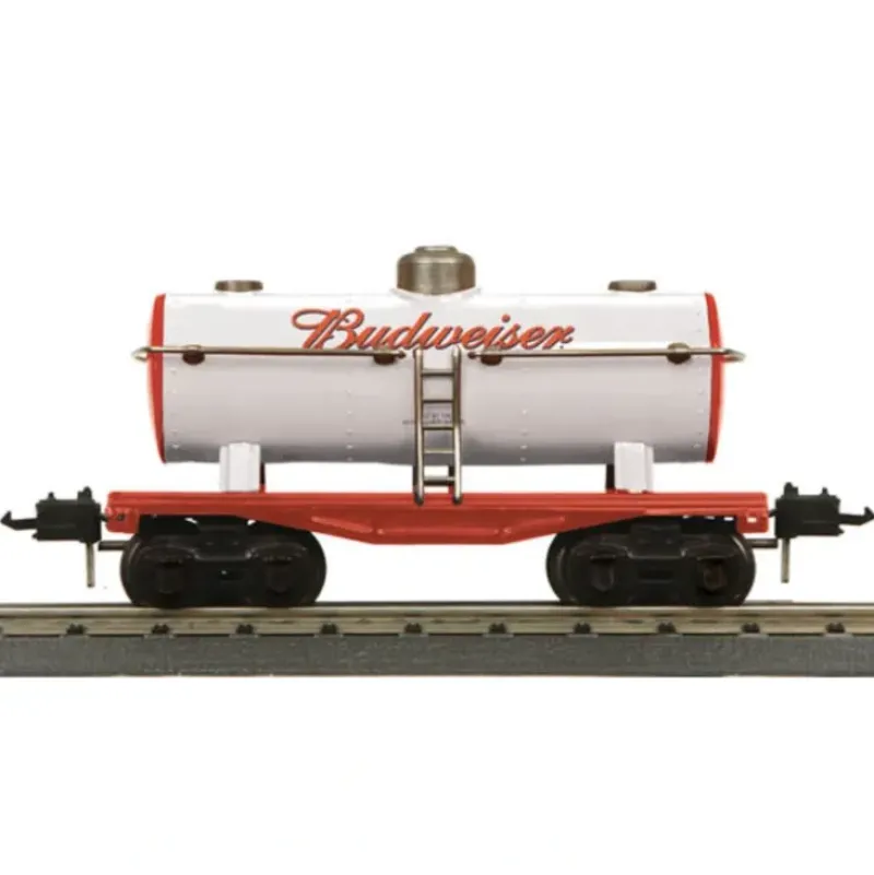 This is MTH 11-70071 BUDWEISER No. 2654 TANK. O gauge tank car. Originally catalogued in 1940 this 2654 O gauge tank car came equipped electric remote control couplers, aluminum finishing, and bright nickel detailing. Catalog numbers, initially in the 600 series, were changed to the 2600 series when new automatic couplers were added in 1938. Part of the 2600 rubber stamped freight car series from M.T.H., this car features baked enamel finishing, stamped steel body and chassis, metal wheels and axels, and operating metal latch couplers. In designing this marvelous new series of Lionel ‘O’ Gauge Freight Cars, our aim has been to express the individuality of every type of commercial freight car used on all railroads. Many new features never before carried out to such perfection are apparent in these cars.