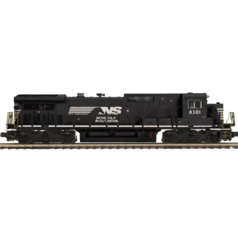 This is MTH 20-20122-1 Norfolk Southern Dash-8 Narrow Nose Diesel w/Protosound. In the late 1980s, as General Electric and General Motors’ Electro-Motive Division engaged in heated competition (that continues today) for market share in the high horsepower category, GE announced its Dash 8 line of diesel locomotives. Although the first demonstrator version had only 3,200 hp, most of the Dash-8s had 4,000 hp when delivered and were therefore designated Dash 8-40. Because GE builds its diesel locomotives in five modules, it was able to customize its Dash 8s for each buyer to an unusual degree. Some railroads ordered their Dash 8s with conventional cabs, while others opted for the wider North American or comfort cabs, identified by a W in the engine name. Some Dash 8s have 4-wheel trucks – denoted with a B – while a Dash 8-40C has 6-wheel trucks. This variety meant that these diesels, which were designed for fast freight duty, also found a home in Amtrak passenger service. Despite their many differences, all Dash 8s share microprocessor control. The microprocessor, a small computer, regulates rpm, fuel injection volume, generator excitation, and many other operational features to make the Dash 8s run more efficiently than any diesels before them.