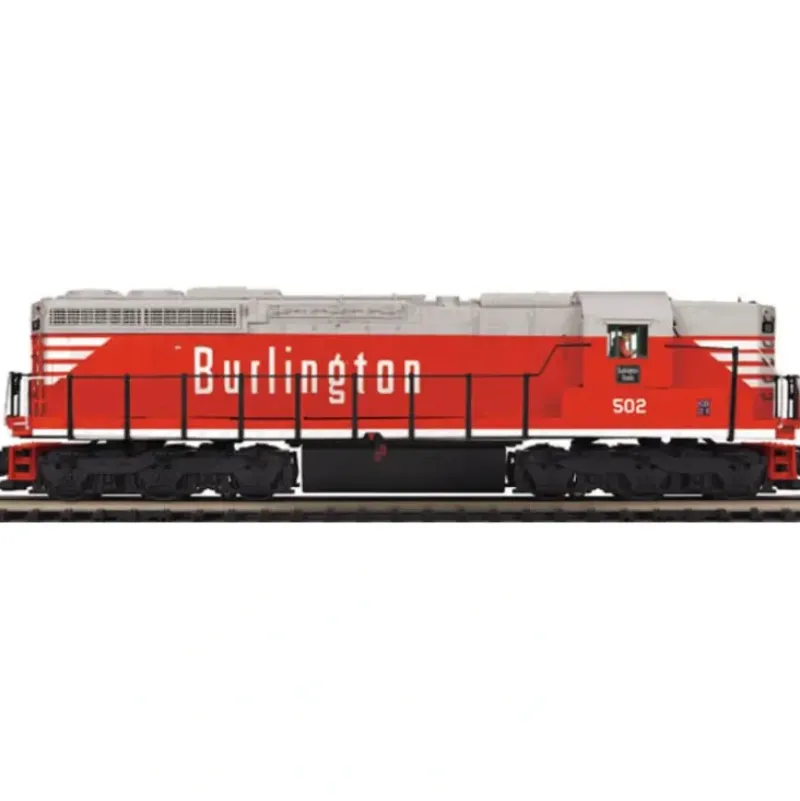 This is MTH 20-20176-1 O SD24 w/PS3, CB&Q. SD24 diesel engine with Proto-Sound 3.0, Burlington (CB&Q). Cab numbers: 502, 506 & 514. In 1958, GM’s Electro-Motive Division took a great technological stride forward with the introduction of the turbocharged SD24. In turbocharged engines, exhaust gases are used to power a turbine that increases cylinder air pressure, thus effectively increasing horsepower. In fact, the 16-cylinder model 567 diesel that produced 1800 horsepower in the normally aspirated SD18 locomotive was upgraded to 2400 horsepower in the turbocharged SD24.