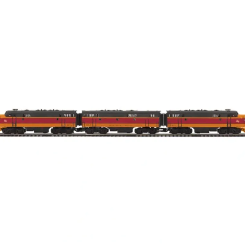 This is MTH 20-20266-2 F-7 ABA w/PS 3.0 MILW Sc. F-7 ABA diesel set with Proto-Sound 3.0 (scale wheels), Milwaukee Road (orange & maroon). Cab numbers: A units – 76A & 120A; B unit – 120B. The F7 was the zenith of the covered wagon, or carbody-style die