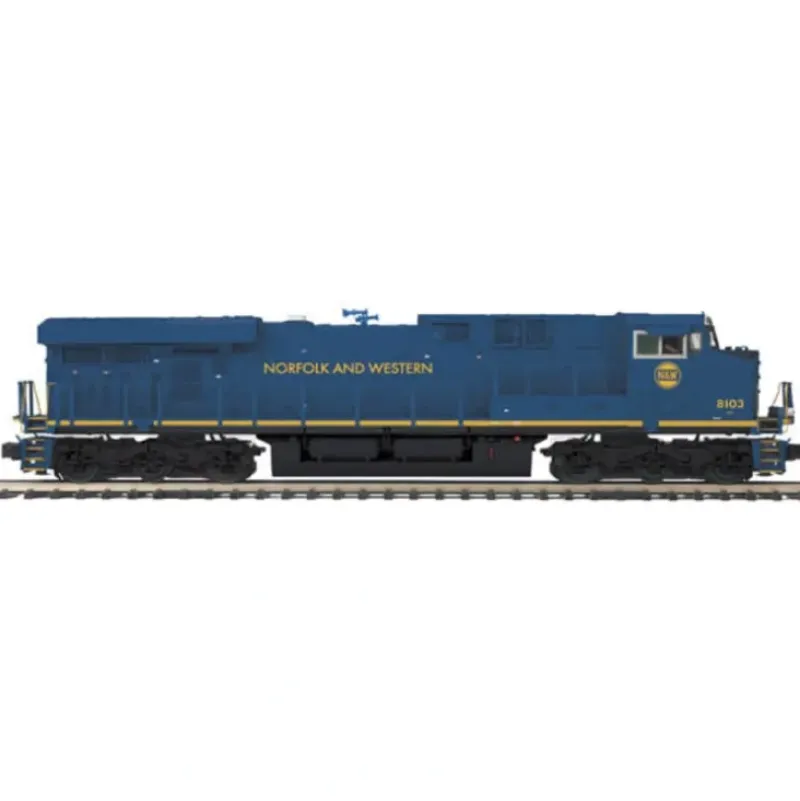 This is MTH 20-20276-3 N&W ES44AC NON-PWR. ES44AC diesel engine (non-powered), Norfolk & Western (NS Heritage). Cab number: 8103. With a wave of consolidation behind it, North American railroading is once again a good business to be in. Freight traffic is booming. Locomotive orders are coming in at a record pace from the Big Six roads that dominate rail transportation on the continent: Union Pacific, BNSF, CSX, Norfolk Southern, Canadian National, and Canadian Pacific. And the two remaining diesel builders are locked in a battle to become the locomotive supplier for the 21st century. Caterpillar-owned EMD, no longer a divison of General Motors, is represented by the AC-traction-motored SD70ACe and its DC-traction sibling, the SD70M-2. General Electrics standard bearers are the EVOs, the Evolution Series ES44AC and ES44DC. At the heart of the Evolution Series is a brand new prime mover, the four-cycle, 12-cylinder GEVO-12. While producing the same 4400 horsepower as its 16-cylinder FDL-series predecessor, the GEVO-12 uses less fuel and spits out 40% fewer emissions. GE claims the EVOs are the most fuel-efficient, most environmentally friendly diesel locomotives in history. Everything about these locomotives has been examined, questioned, and re-thought, generating 25 new U.S. patents in the process. And every Big Six railroad has ponied up to buy them, with the BNSF currently rostering the largest EVO fleet. Like all Premier locomotives, the ES44AC offers O scales finest combination of detail, realism, and performance. Listen to the chant of an authentic GEVO-12 motor, and throttle down as low as three scale miles per hour so you can admire the details as the Evolution Series glides by: see-through fans and grilles, walkways with safety tread, opening doors with working door handles, and a host of other separately applied metal details. Did You Know? Fully loaded, an Evolution Series diesel carries 5000 gallons of diesel fuel, 450 gallons of lube oil, and 400 gallons of cooling water. Its key features are: Intricately detailed ABS body Directionally controlled headlights 1:48 scale proportions Metal wheels and axles Two operating metal couplers Die-cast truck sides, pilots and fuel tank Authentic paint scheme Metal chassis Metal handrails and decorative horn Illuminated number boards Two engineer cab figures Moveable roof fan blades Metal body side grilles Operating ditch lights Unit measures: 18 1/2 x 2 5/8 x 4 Operates on O-42 curves