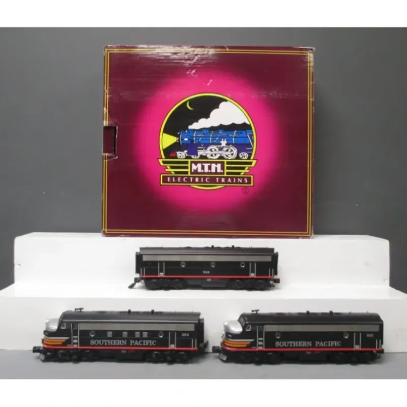 This is MTH 20-20390-1 O Hi-Rail F7 A/B/A w/PS3, SP. F-7 ABA diesel set with Proto-Sound 3.0 (hi-rail wheels), Southern Pacific (black widow). Cab numbers: A units – 352 & 354; B unit – 543.