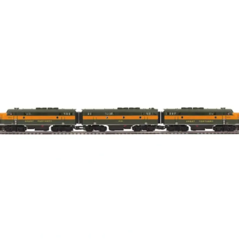 This is MTH 20-20402-1 O Hi-Rail F3 A/B/A w/PS3, GN. F-3 ABA diesel set with Proto-Sound 3.0 (hi-rail wheels), Great Northern. Cab numbers: A units – 353-C & 357-A; B unit – 353B. From 1942-1945, Electro Motive Division’s F-unit was the only road freight diesel built in America. While the War Production Board limited competitors Alco and Baldwin to diesel switcher and steam locomotive production during World War II, EMD’s 1,350 hp FT became a runaway best-seller. By war’s end, Electro Motive had a lead over its competitors that would last until they closed their doors. With production restrictions lifted and the U.S. economy humming with pent-up demand, railroads clamored for new diesels to replace a steam fleet exhausted by wartime traffic. In July 1946, EMD introduced a new model F-unit, the F3. Horsepower was upgraded to 1,500 and lessons learned on the FT gave the F3 better reliability and lower maintenance. Under the hood throbbed an improved 567-series V-12 engine. With 567 inches of displacement per cylinder, this same engine would power virtually the entire first generation of EMD diesel locomotives.