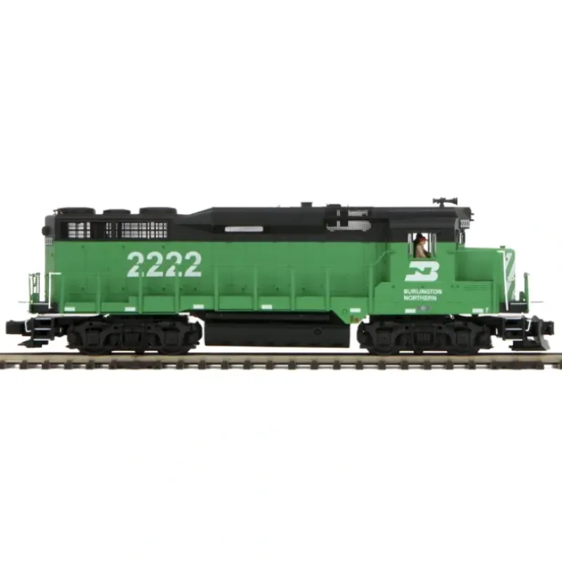 This is MTH 20-20413-1 O GP-30 w/PS3, BN. GP-30 diesel engine with Proto-Sound 3.0, Burlington Northern. Cab numbers: 2200, 2213 & 2215. According to EMD’s normal naming practice, the new engine should have been called the GP22 – but that hardly sounded competitive with the U25B. So the marketing department dubbed the new model the GP30, claiming it had 30 distinct improvements over the GP20. In fact, the GP30 turned out to be an excellent locomotive. During a production run of just over two years, from July 1961-November 1963, 948 units were sold to railroads across America, nearly double the quantity of U25Bs sold during six years of production. Although slightly less powerful, the Geep was a known quantity, with an engine and other parts familiar to virtually every railroad’s maintenance department. Advertised by EMD as a combination high speed and heavy drag locomotive, the GP30 immediately took over from first generation diesels as premier mainline freight power. Although bumped to lesser service by more powerful engines later in life, many served over four decades, considerably longer than the expected service life of a diesel. Some railroads, like the Burlington Northern and Chessie System, operated rebuild programs that upgraded old GP30s to higher specs and kept them running late into the 20th century. Its key features are: Two remotely controlled Proto-Couplers Metal chassis Two precision flywheel equipped motors Illuminated number boards Intricately detailed abs body Directionally controlled headlights Die-cast truck sides, pilots and fuel tank Authentic paint scheme Metal handrails and decorative horn Lighted cab interior Lighted marker lights Two engineer cab figures Spinning roof fans Metal body side grilles Operating smoke unit Metal wheels, axles and gears Locomotive speed control in scale MPH increments Proto-Scale 3-2 3-rail/2-rail conversion capable Proto-Sound 3.0 with The Digital Command System featuring: Freight yard Proto-Effects Unit measures: 15 x 2 3/4 x 4 1/4 Operates on O-31 curves Diesel DCC features: Headlight/Taillight Bell Horn Start-up/Shut-down Passenger station/Freight yard announcements Lights (except head/tail) Master volume Front coupler Forward signal Rear coupler Reverse signal Grade crossing Idle sequence 3 Idle sequence 2 Idle sequence 1 Extended start-up Extended shut-down Rev up Rev down One shot Doppler Coupler slack Coupler close Single horn blast Engine sounds Brake sounds Cab chatter Feature reset Smoke on/off Smoke volume