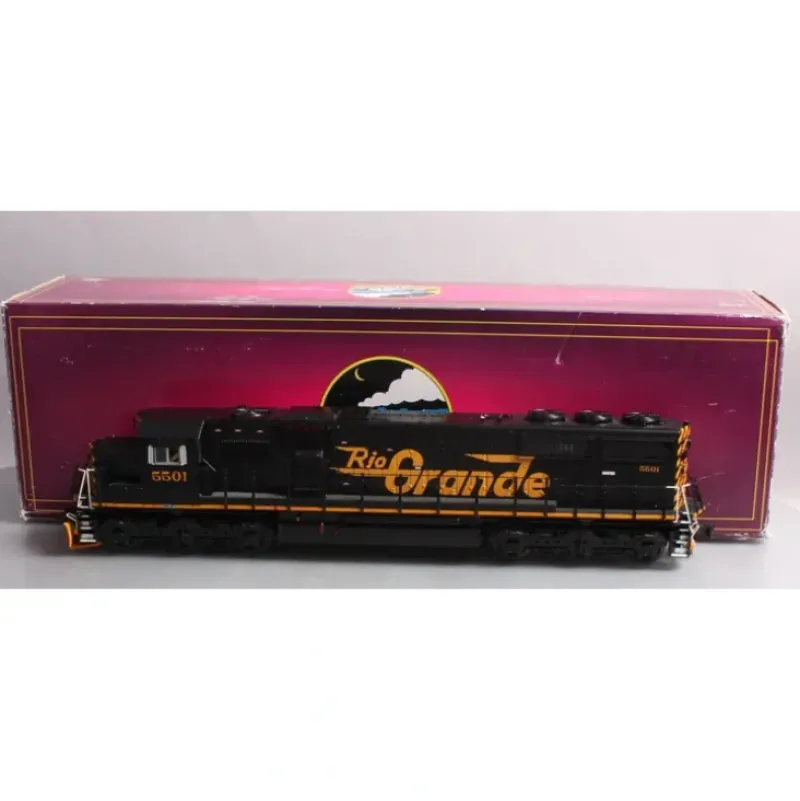 This is a MTH 20-20425-1 O Gauge D&RGW SD50 Diesel Engine w/PS3 #5501 (Hi-Rail Wheels). EMD’s 50 Series diesel locomotives of the mid-1980s were the product of the most extensive testing in the company’s 50-year history. Both the four-axle, four-motor GP50 and the six-axle, six-motor SD50 utilized a new control system that substantially increased hauling capacity and reduced engine noise levels. The 3500 hp SD50 measured just 30 longer than the SD40-2 it replaced but differed substantially in appearance. Gone were the front and rear porches of the SD40-2 and the dynamic brake blisters on the sides of its hood. Under the SD50’s longer hood, the dynamic brakes, which generate a lot of heat, were relocated from a position over the hot engine to a cleaner, cooler area just behind the cab. The SD50 also introduced EMD’s new Super Series control system, which included a radar unit for measuring true ground speed and electronic monitoring of the electrical equipment. A primary benefit of the new control system was its ability to maximize rail adhesion by automatically applying short bursts of sand as needed to maintain traction. The system allowed three SD50s to do the work of four older locomotives. Its key features are: Directionally controlled headlights Intricately detailed ABS body Metal wheels, axles and gears Die-cast truck sides, pilots and fuel tank Two remotely controlled Proto-Couplers Colorful paint scheme Metal chassis Metal handrails and decorative horn Two precision flywheel equipped motors Locomotive speed control Proto-Scale 3-2 3-rail/2-rail conversion capable Lighted cab interior Illuminated number boards Lighted marker lights Two engineer cab figures Metal body side grilles Operating smoke unit Moveable roof fan blades Proto-Sound 3.0 with The Digital Command System featuring: Freight yard Proto-Effects Unit measures: 17 _ x 3 _ x 2 Operates on O-42 curves Diesel DCC features: Headlight/Taillight Bell Horn Start-up/Shut-down Passenger station/Freight yard announcements Lights (except head/tail) Master volume Front coupler Rear coupler Forward signal Reverse signal Grade crossing Idle sequence 3 Idle sequence 2 Idle sequence 1 Extended start-up Extended shut-down Rev up Rev down One shot Doppler Coupler slack Coupler close Single horn blast Engine sounds Brake sounds Cab chatter Feature reset Smoke on/off Smoke volume