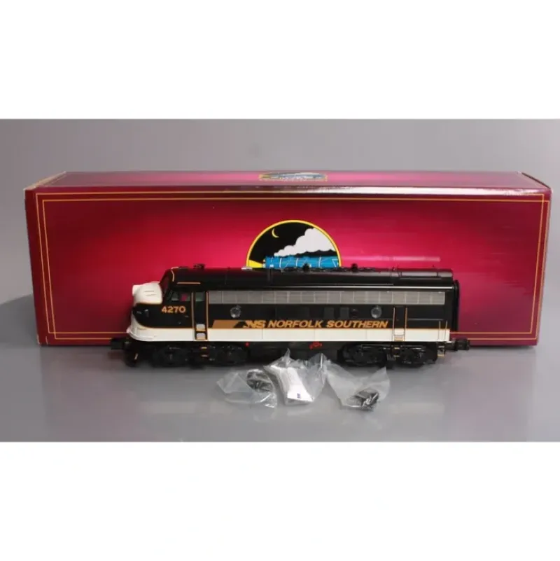 This is a MTH 20-205561 O Norfolk Southern F-7 A Unit Diesel Engine w/ Proto-Sound 3.0 (Hi-Rail Wheels) #4270. This features Intricately Detailed Durable ABS Body, Die-Cast Truck Sides, Pilots and Fuel Tank, Metal Chassis, Metal Handrails and Horn, Moveable Roof Fans, Metal Body Side Grilles, (2) Handpainted Engineer Cab Figures, Authentic Paint Scheme, Metal Wheels, Axles and Gears, (2) Remote Controlled Proto-Couplers, O Scale Kadee-Compatible Coupler Mounting Pads, Prototypical Rule 17 Lighting, Directionally Controlled Constant Voltage LED Headlights, Lighted Cab Interiors, Illuminated Number Boards, Lighted Marker Lights, (2) Precision Flywheel-Equipped Motors, Operating ProtoSmoke Diesel Exhaust, Onboard DCC/DCS Decoder, Locomotive Speed Control In Scale MPH Increments, Proto-Scale 3-2 3-Rail/2-Rail Conversion Capable, 1:48 Scale Proportions, Lighted LED Cab Interior Light, Illuminated LED Number Boards, Lighted LED Marker Lights, Proto-Sound 3.0 With The Digital Command System Featuring: Passenger Station Proto-Effects, Unit Measures:13 x 2 5/8 x 3 3/4, and Operates On O-31 Curves.