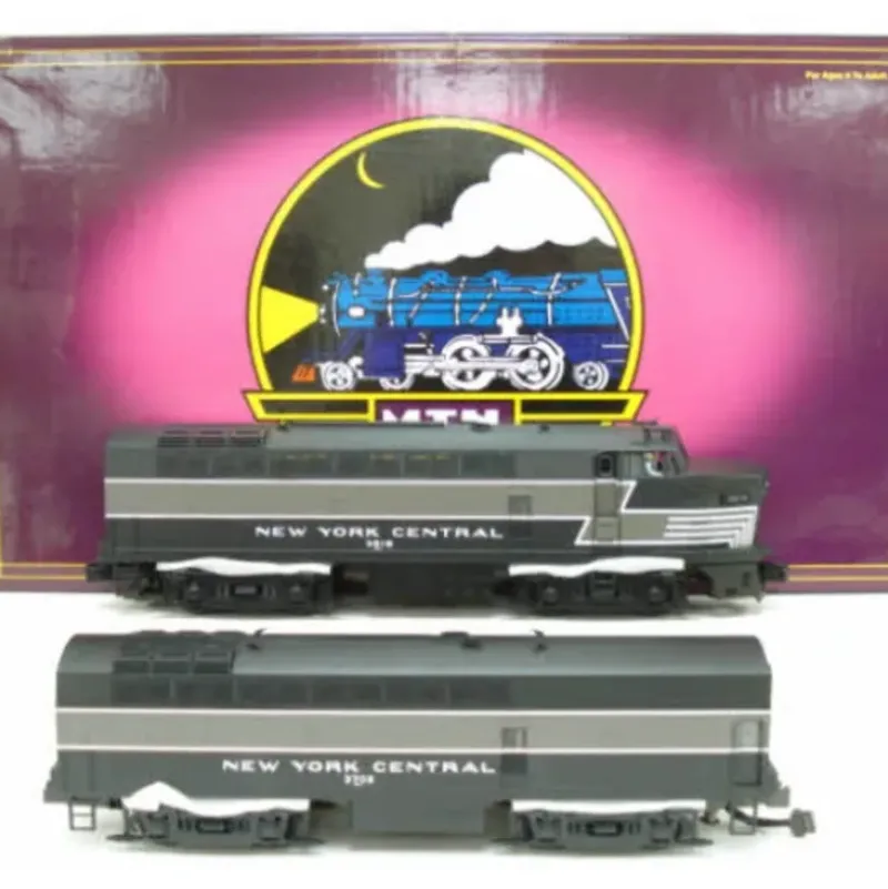This is an MTH 20-2294-1 New York Central Sharknose AB Diesel Locomotive Set with Protosound 2.0 from 2001. Features include 2 precision flywheel equipped motors in each unit, a directionally controlled headlight, an illuminated cab interior and number boards, lighted marker lights, metal chassis, 2 cab figures and protosound 2.0 with freight yard proto effects.