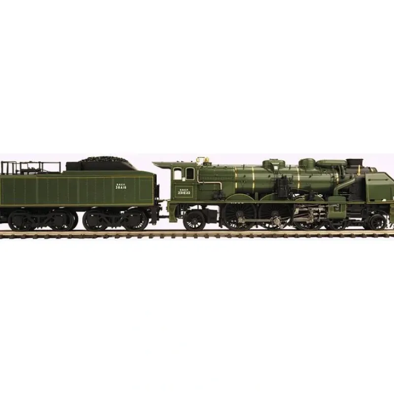 This is MTH 20-3450-2 2-3-1 Orient Exp Scl #E22. 2-3-1 Pacific steam engine with Proto-Sound 3.0 (wcale wheels), Orient Express (green boiler). Cab number: 231E35. The history of locomotives is the story of an ever-increasing need for speed and power, as trains became heavier and schedules more demanding. On Frances Paris-Orleans (PO) Railway in the mid-1920s, management saw electrification as the answer, and development of new steam locomotives came to a halt. But Andr Chapelon, a young development engineer, had different ideas. He persuaded his superiors to let him drastically rebuild one of the POs aging Pacifics, and the result cemented his reputation as one of the greatest locomotive designers ever. Chapelon analyzed the design of the steam engine from end to end, from the cold water in the tender to the steam exiting the stack. He modified the boiler and firebox to produce more steam with the same amount of fuel, and opened up nearly every steam passage to improve the flow of steam in and out of the cylinders. Testing proved his rebuilt engine delivered 85% more horsepower and was more efficient to operate music to the ears of the very managers who had resisted his ideas for years.
