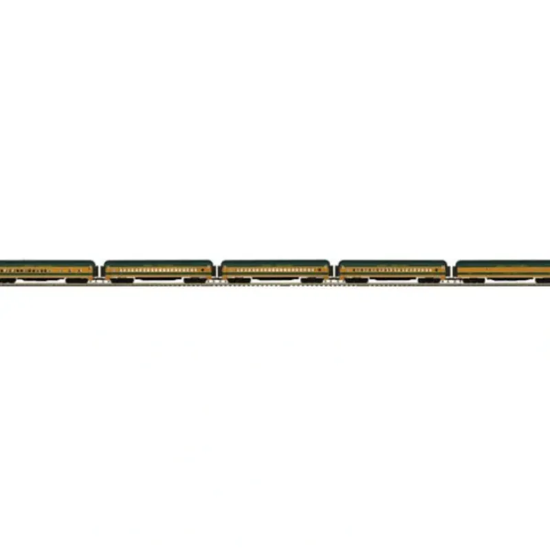 This is MTH 20-40011 O Great Northern 70′ Madison Passenger Car Set (Set of 5). This Cars Feature: Fast angle wheel sets, Metal wheels and axles, Overhead interior lighting, Die-cast 6-wheel trucks, Sliding baggage car doors, End of car diaphragms, Separate metal handrails, Detailed ABS bodies, car undercarriage and car interiors, Needle point axles, Operating die-cast metal couplers & Hand painted interior figures