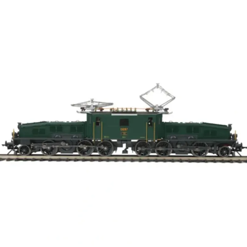 This is MTH 20-5668-2 O Be 6/8 II Crocodile Electric Loco/dk.grn./3.0. Be 6/8 II Crocodile electric engine with Proto-Sound 3.0 (scale wheels), dark green. Cab number: 13257. In a country famous for mountain railroading, the Gotthard route is the greatest challenge, the one by which the Swiss Federal Railways measures its locomotives. Constructed at a cost of more than 200 lives, the Gotthard line snakes its way around spiral tunnels, across more than a thousand bridges and open passages, and through narrow mountain valleys, culminating in a 2.6% climb to the 9-mile-long Goddard Tunnel – the longest in the world when it was opened in 1882. The Gotthard was the stomping ground for the 2-10-0 Elephants, the largest steam engines ever used in Switzerland. But when the decision was made to electrify the route, the Elephants were replaced by Crocodiles.