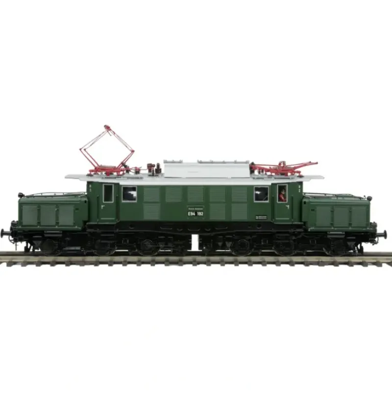 This is MTH 20-5673-2 E94 Croc w/Snd Scale DB. E94 crocodile electric engine with Proto-Sound 3.0 (scale wheels), German DB (green). The center section of the E94 is supported on the truck frames on large pivots giving the locomotive an articulated apearance and it’s popular Alligator nickname. The center section contains the main transformer fed from overhead pantographs which in turn pull power from the catenary lines centered above the rail line. A passageway inside the center section allows crew members to traverse the locomotive from one end to the other. Like the popular Swiss Crocodile of 2012, this all-new die-cast O Scale model is fully outfitted with digital sound, LED lighting and motorized operating pantographs and are available in both 3-Rail high-rail wheeled versions and 2-rail Fine Scale wheeled versions. Choose from four exciting liveries, two in Deutsche Bundesbahn schemes and two in Austrian Federal Railway schemes. Its key features are: Intricately detailed die-cast body Die-cast truck sides & pilots Die-cast metal chassis Metal handrails and decorative horn Two engineer cab figures Authentic paint scheme Sprung buffers Metal wheels, axles and gears NEM 340 metal wheels Kadee compatible coupler mounting pads Two NEM 362 LENZ compatible couplers Two NEM 365 coupler & pocket assemblies Directionally controlled constant voltage LED headlights Lighted cab interior Two precision flywheel equipped motors Motorized operating pantographs Onboard DCC receiver Locomotive speed control in scale MPH increments Proto-Scale 3-2 3-rail/2-rail conversion capable 1:45 scale proportions Proto-Sound 3.0 with The Digital Command System featuring: Freight yard Proto-Effects Unit measures: 413mm x 69.5mm x 99.85mm Operates on 36 radius curves Diesel DCC features: Headlight/Taillights Bell on/off Horn blast Start-up/Shut-down sounds Passenger station/Freight yard sounds Lights (except head/tail lights) Master volume up/down Front coupler open Rear coupler open Forward horn signal Reverse horn signal Grade crossing signal Idle sequences 2 Idle sequences 1 Extended start-up sounds Extended shut-down sounds One shot Doppler effect Coupler slack sound Coupler close sound Single horn sound blast Engine sound on/off Brake sound on/off Cab chatter sounds Feature reset activation Panto auto/manual Front panto up/down Rear panto up/down Train marker