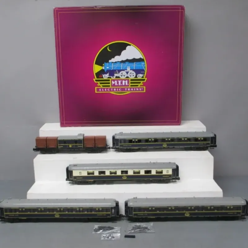 This is MTH 20-60022 O ORIENT EXP 5CAR PASS SET. 5-car Orient Express add-on passenger set (hi-rail wheels) – Orient Express (blue). It is hard to match the excitement and beauty of a long, sleek passenger train speeding down the rails. M.T.H.’s Premier Line scale streamlined passenger cars and sets will bring exactly the right, realistic look to your passenger consists.