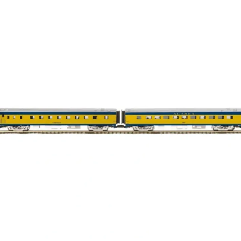 This is MTH 20-66235 O Alaska 2pk 70′ Smoothside Sleeper/Diner Psg.Cars. 2-car 70′ ABS sleeper/diner passenger set (smooth) – Alaska. Car names/numbers: Sleeper – Cook Inlet; Diner – 5004. It is hard to match the excitement and beauty of a long, sleek pas