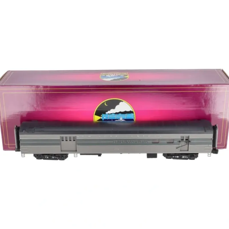 This is MTH 20-68237 70′ RPO Pass Car NYC. 70′ ABS RPO passenger car (smooth), New York Central (1940). Car number: 5015. The majority of lightweights were 8085 long, which scales out to about 21 in O gauge. Many O gauge modelers, however, find cars of this length impractical, as they require large curves and create long trains that can overwhelm a typical-sized layout. For those reasons, our Premier lightweights are about 70 scale feet in length reproducing the look and feel of prototype streamliners in a model that will round O-42 curves with ease and look at home on most scale-detailed O gauge layouts.It is hard to match the excitement and beauty of a long, sleek passenger train speeding down the rails. M.T.H.’s Premier Line scale streamlined passenger cars and sets will bring exactly the right, realistic look to your passenger consists.